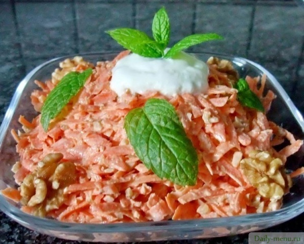 морковь, сметана 10,0% жирности, орех грецкий, сахар-песок, яблочный уксус, чеснок