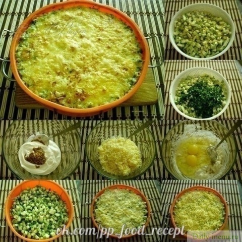 кабачок, сыр твердый (маасдам), яйцо куриное, сметана 15,0% жирности, горчица столовая, укроп и другие пряные травы, соль поваренная пищевая