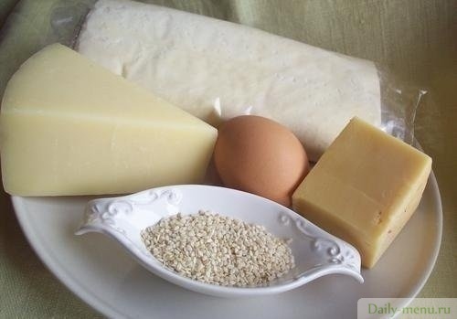 слоеное тесто дрожжевое, сыр твердый (маасдам), сыр мягкий (моцарелла), кунжут-семя, яйцо куриное
