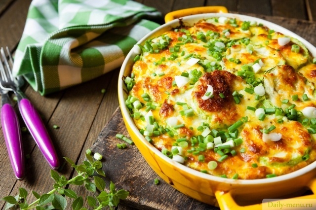 брокколи, цуккини, курица филе, без кожи, яйцо куриное, сыр пармезан, сливки 30% жирности, лук репчатый, чеснок, соль поваренная пищевая, масло топленое, перец черный молотый