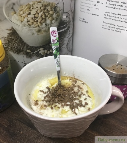 яйцо куриное, кокосовое молоко aroy-d, топленое масло, кокосовая мука, семя льна, корица