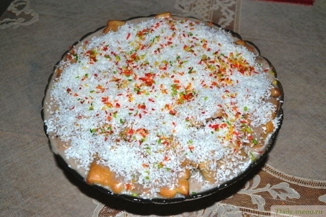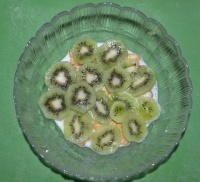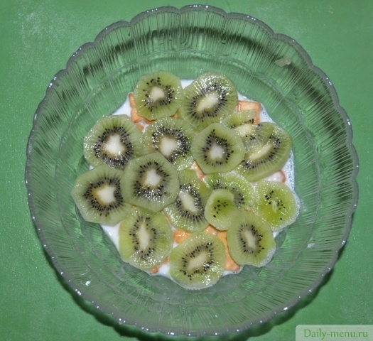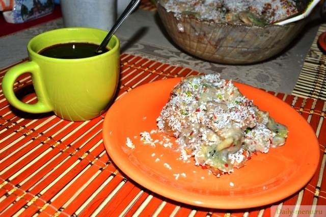 банан, киви, сметана 10,0% жирности, печенье крекер, сахарная пудра, кокосовая стружка