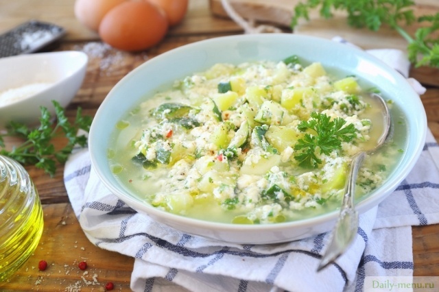 куриный бульон, кабачок, яйцо куриное, сыр гауда, сок лимонный, петрушка, соль поваренная пищевая, перец черный молотый