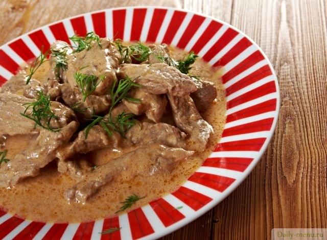 говядина вырезка, сметана 40% жирности, вода, масло топленое, укроп и другие пряные травы, соль поваренная пищевая, перец черный молотый, лук репчатый, сушеный, чеснок сушеный