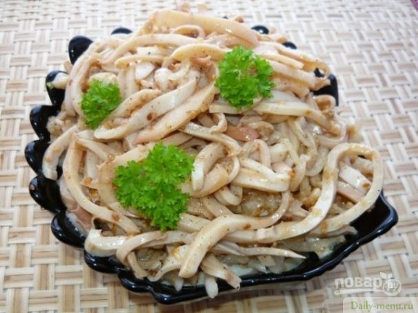 кальмар, рисовый уксус, соевый соус, масло подсолнечное, чеснок, кориандр, перец черный молотый