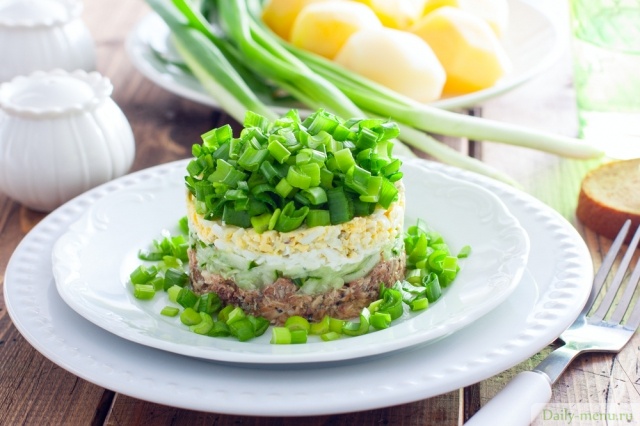 скумбрия натуральная консервы, яйцо куриное, огурец грунтовый, майонез , лук зеленый, соль поваренная пищевая