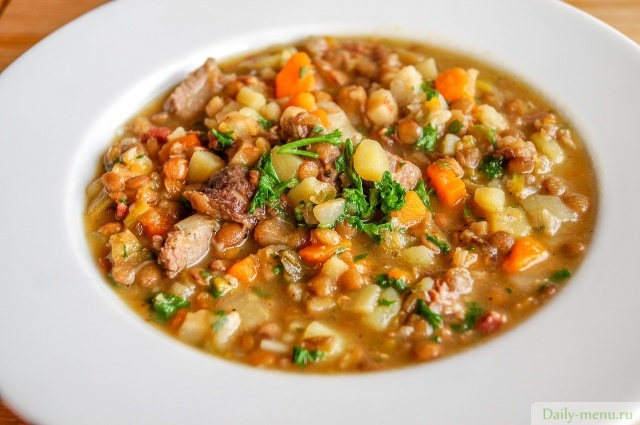 вода, картофель, говядина вырезка, чечевица зерно, морковь, лук репчатый, масло оливковое, петрушка, соль поваренная пищевая, перец черный молотый, лавровый лист