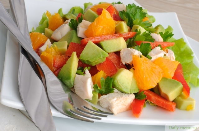 куриная грудка, без кожи, помидоры, мандарин, авокадо, масло грецкого ореха, петрушка, сок лимонный, соль поваренная пищевая