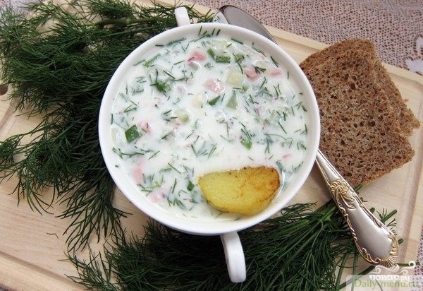 кефир 1% жирности, вода минеральная, яйцо куриное, огурец грунтовый, колбаса вареная докторская, укроп и другие пряные травы, горчица столовая, перец черный молотый, соль поваренная пищевая
