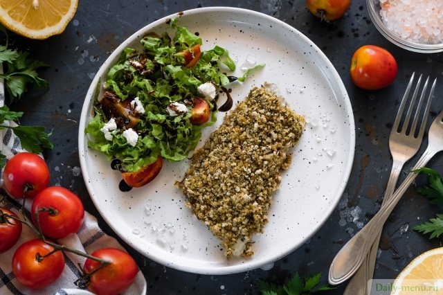 кета, сухари панировочные, сыр маасдам, масло оливковое, петрушка, укроп и другие пряные травы, соль поваренная пищевая