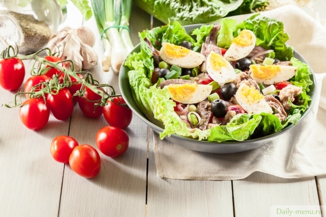 фасоль стручковая, картофель вареный, тунец натуральный консервы, перец красный сладкий, маслины средние и мелкие, яйцо куриное, салат, помидоры, анчоусы атлантические, масло оливковое, винный уксус 3%, чеснок, соль поваренная пищевая, перец черный молотый