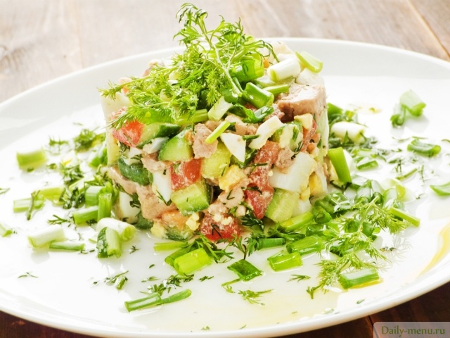 горбуша натуральная консервы, яйцо куриное, помидоры, огурец грунтовый, масло оливковое, петрушка, укроп и другие пряные травы, сок лимонный, соль поваренная пищевая