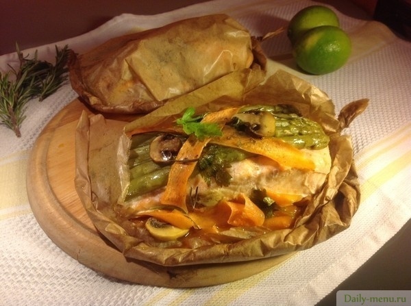 семга свежая, спаржа свежая, морковь, шампиньоны, масло оливковое, перец белый, сок лаймы, сок лимонный, перец черный молотый, петрушка, укроп сухой, соль поваренная пищевая, розмарин сухой