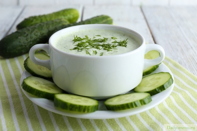 вода, огурец грунтовый, цуккини, сметана 18% жирности, сок лимонный, лук зеленый, укроп и другие пряные травы, кинза, соль поваренная пищевая