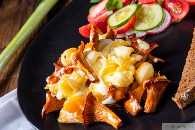 лисички, яйцо куриное, лук репчатый, масло топленое, соль поваренная пищевая, перец черный молотый