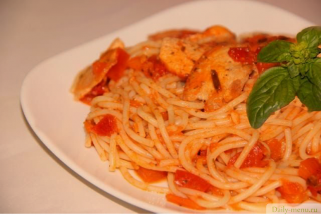 помидоры. консервы, филе куриное, спагетти, лук репчатый, чеснок, масло растительное