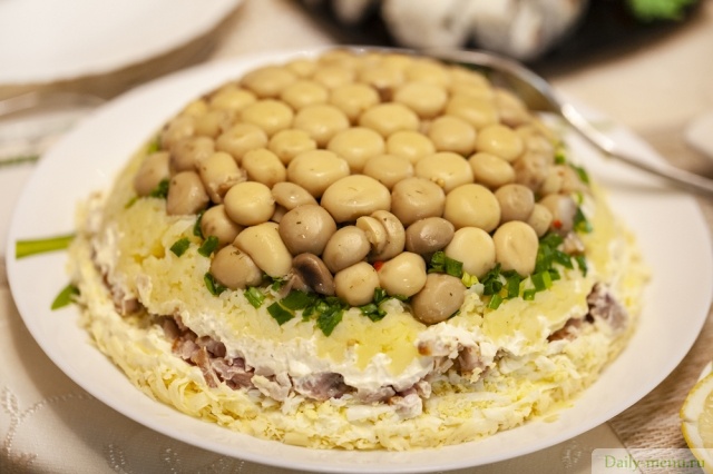 шампиньоны консервированные, курица филе, без кожи, огурец соленый, морковь корейская, майонез , сыр голландский, картофель вареный, лук репчатый, укроп и другие пряные травы