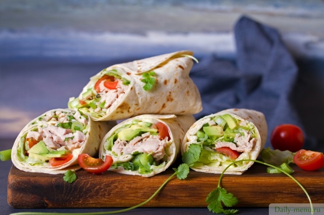 лаваш армянский, тонкий, бедро куриное с кожей, авокадо, помидоры, салат, кинза, перец черный молотый