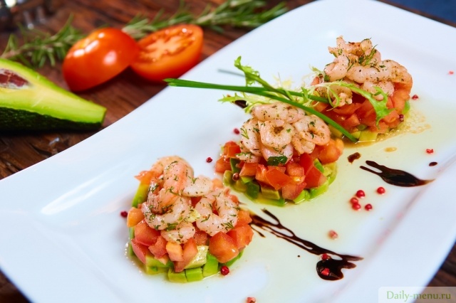 креветки очищенные, помидоры, авокадо, лук репчатый, укроп и другие пряные травы, масло оливковое, сок лимонный, чеснок, соль поваренная пищевая, перец красный жгучий