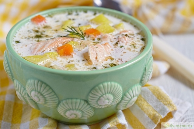 вода, горбуша, картофель, сливки, 20,0% жирности, морковь, лук репчатый, масло топленое, соль поваренная пищевая, перец черный молотый
