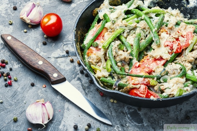 яичный белок куриный, фасоль стручковая, помидоры, лук репчатый, масло оливковое, перец черный молотый