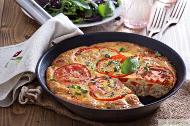яйцо куриное, сливки, 10,0% жирности, ветчина особая, сыр голландский, помидоры, перец болгарский красный, лук репчатый, масло топленое, соль поваренная пищевая, перец черный молотый