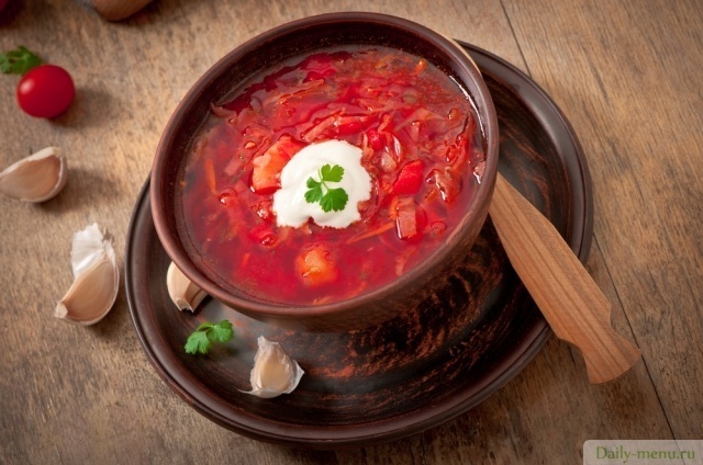 вода, говядина вырезка, свекла, капуста белокочанная, лук репчатый, морковь, томатная паста, уксус 3%