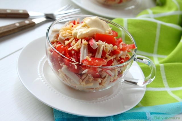 помидоры, крабовые палочки, перец болгарский красный, сыр голландский, майонез , чеснок, соль поваренная пищевая