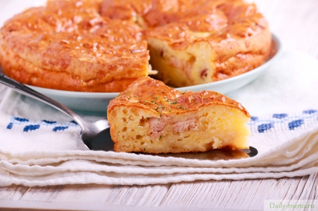 кефир 2,7% жирности, ветчина особая, мука пшеничная , сыр голландский, яйцо куриное, масло оливковое, соль поваренная пищевая, пищевая сода
