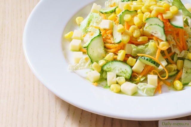 капуста пекинская, кукуруза консервы, морковь, огурец грунтовый, яблоки, масло оливковое, сок лимонный, сахар-песок, соль поваренная пищевая