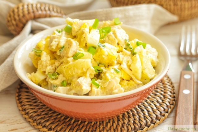 курица филе, без кожи, ананас консервированный, майонез , масло топленое, чеснок, соль поваренная пищевая, хмели-сунели