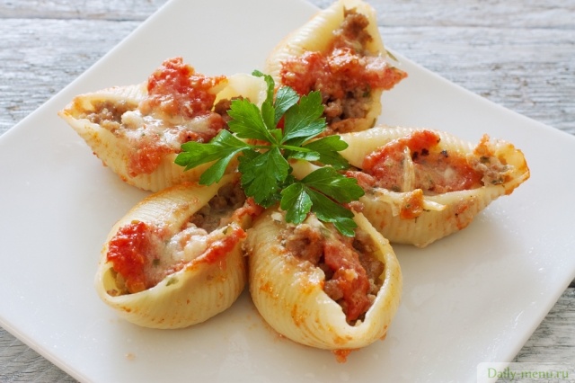 шампиньоны, макароны из муки в/с, сыр голландский, лук репчатый, сметана 20,0% жирности, соус томатный острый, масло топленое, соль поваренная пищевая, перец черный молотый, прованские травы
