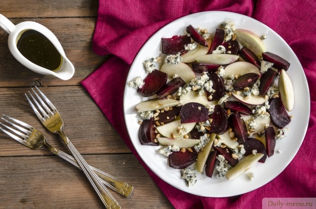 свекла, яблоки, сыр дор блю, масло оливковое, орех грецкий, сок лимонный, яблочный уксус, сахар-песок, соль поваренная пищевая