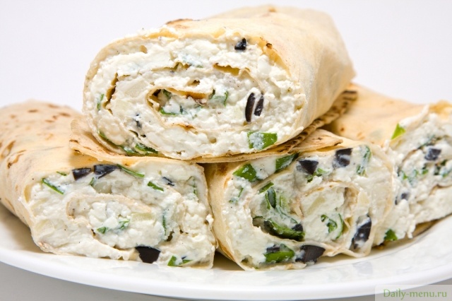 творог, 9 %, лаваш армянский, тонкий, сметана 20,0% жирности, маслины средние и мелкие, лук зеленый, масло оливковое, соль поваренная пищевая