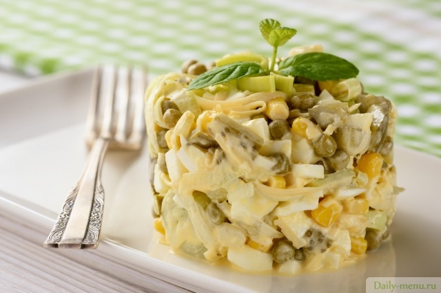 огурец маринованный, горошек зеленый. консервы, яйцо куриное, лук-порей, кукуруза консервы, сметана 20,0% жирности, соль поваренная пищевая