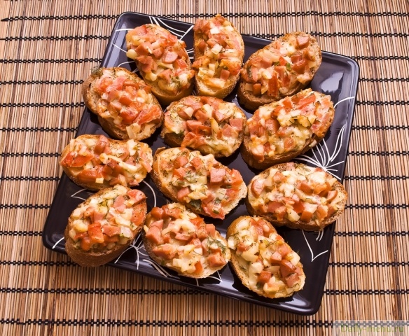 батон нарезной, колбаса вареная докторская, сыр моцарелла, помидоры, масло сливочное 72%, петрушка, соль поваренная пищевая, перец черный молотый