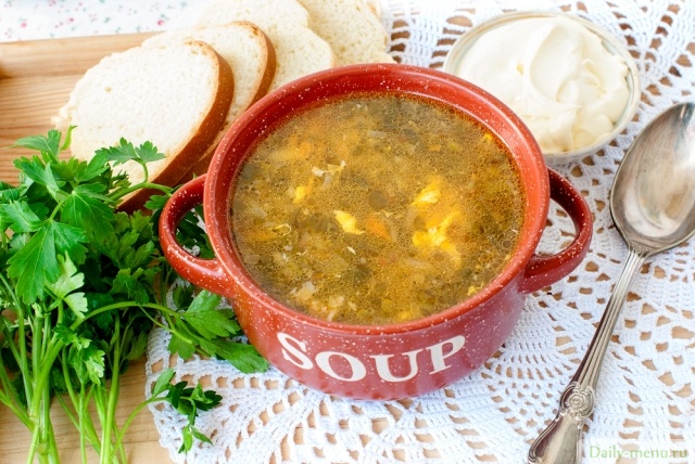 куриный бульон, щавель, яйцо куриное, морковь, лук репчатый, масло оливковое, соль поваренная пищевая