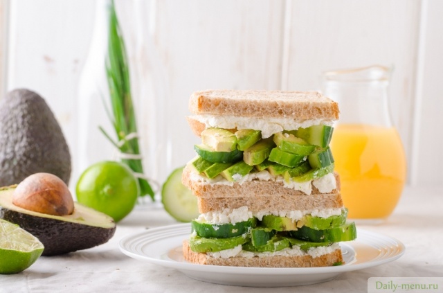 авокадо, хлеб ржано-пшеничный, творог 11%, огурец грунтовый, сметана 18% жирности, сок лимонный, соль поваренная пищевая