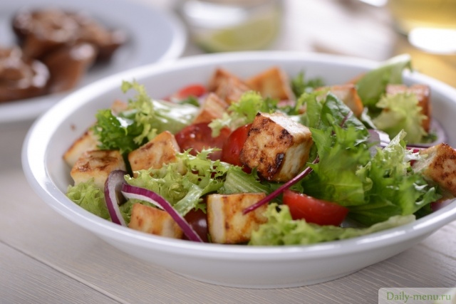 помидоры, сыр адыгейский, лук репчатый, салат, масло оливковое, масло топленое, яблочный уксус, соль поваренная пищевая
