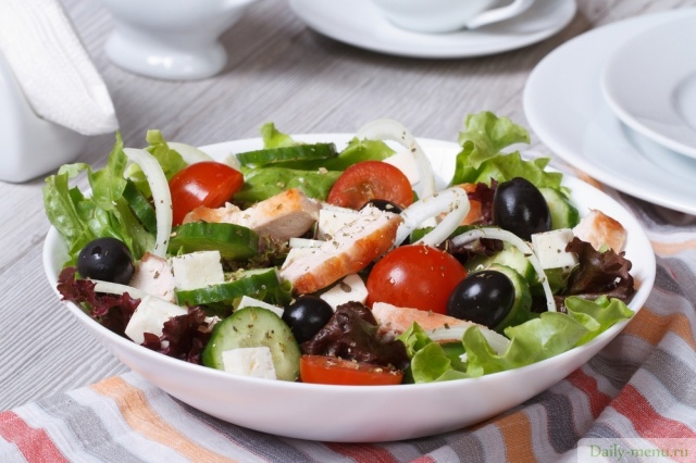 помидоры, маслины средние и мелкие, огурец грунтовый, курица копчено-вареная, сыр фета, лук репчатый, салат романо, масло оливковое, сок лимонный, соль поваренная пищевая, перец черный молотый