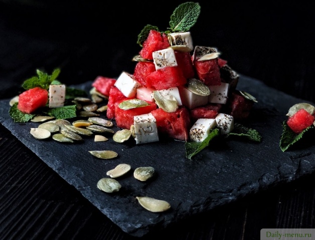 арбуз, сыр фета, маслины средние и мелкие, семя тыквы, мята свежая, перец черный молотый