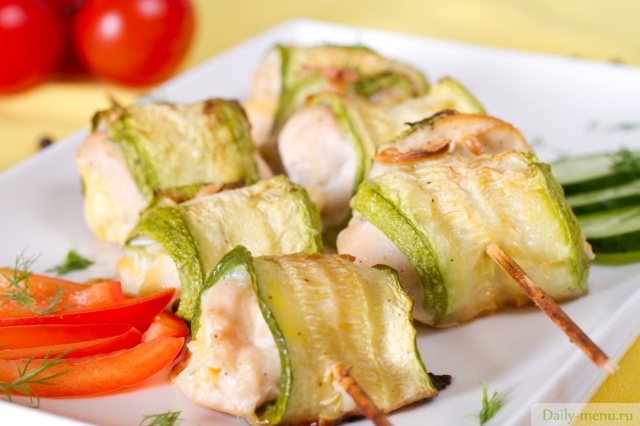 курица филе, без кожи, цуккини, сыр костромской, сметана 20,0% жирности, творог 8%, чеснок, укроп и другие пряные травы, петрушка, соль поваренная пищевая, перец черный молотый