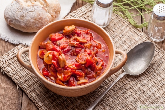 перец болгарский красный, помидоры, сосиски столичные, лук репчатый, масло оливковое, чеснок, томатная паста, соль поваренная пищевая, сахар-песок, паприка сушёная, молотая, перец черный молотый