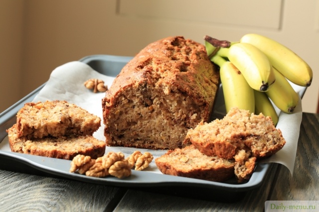 банан, мука цельнозерновая, яйцо куриное, масло кокосовое, сметана 18% жирности, изюм, орех грецкий, пищевая сода, соль поваренная пищевая, корица, ванильный сахар