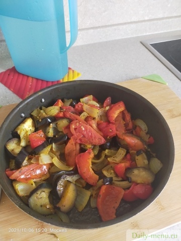 лук репчатый, баклажаны, перец болгарский красный, помидор (томат), парниковый, масло подсолнечное рафинированное [злато], зелень ю.м., специи