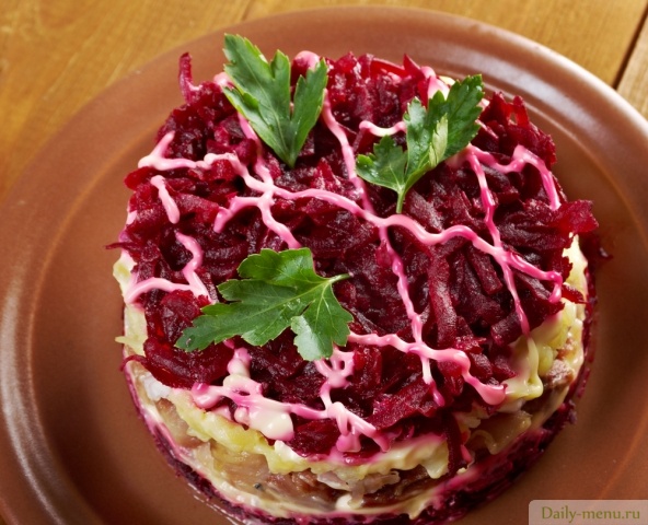 огурец соленый, свекла, яйцо куриное, картофель, морковь, сметана 20,0% жирности, майонез , яблоки, лук репчатый, яблочный уксус