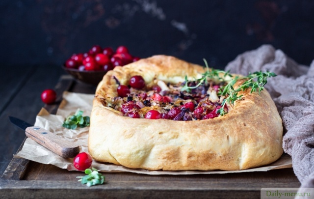 капуста белокочанная, мука пшеничная , вода, капуста белокочанная, квашеная, яблоки, клюква, лук репчатый, масло топленое, масло оливковое, сахар-песок, дрожжи сухие, соль поваренная пищевая