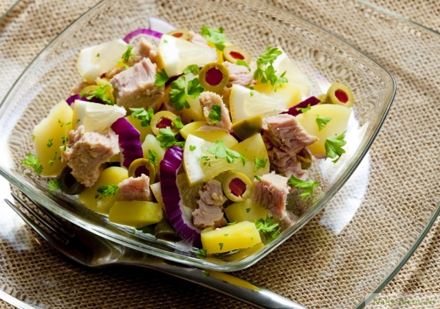 картофель вареный, тунец натуральный консервы, оливки. консервы, лук репчатый, лимон, масло оливковое, петрушка, соль поваренная пищевая, перец черный молотый