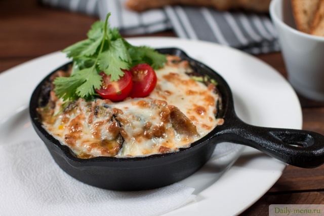 баклажаны, сыр моцарелла, сметана 20,0% жирности, лук репчатый, масло оливковое, соль поваренная пищевая, смесь перцев
