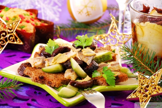 сельдь, огурец маринованный, чернослив, хлеб ржаной, масло оливковое, бальзамический уксус, горчица столовая